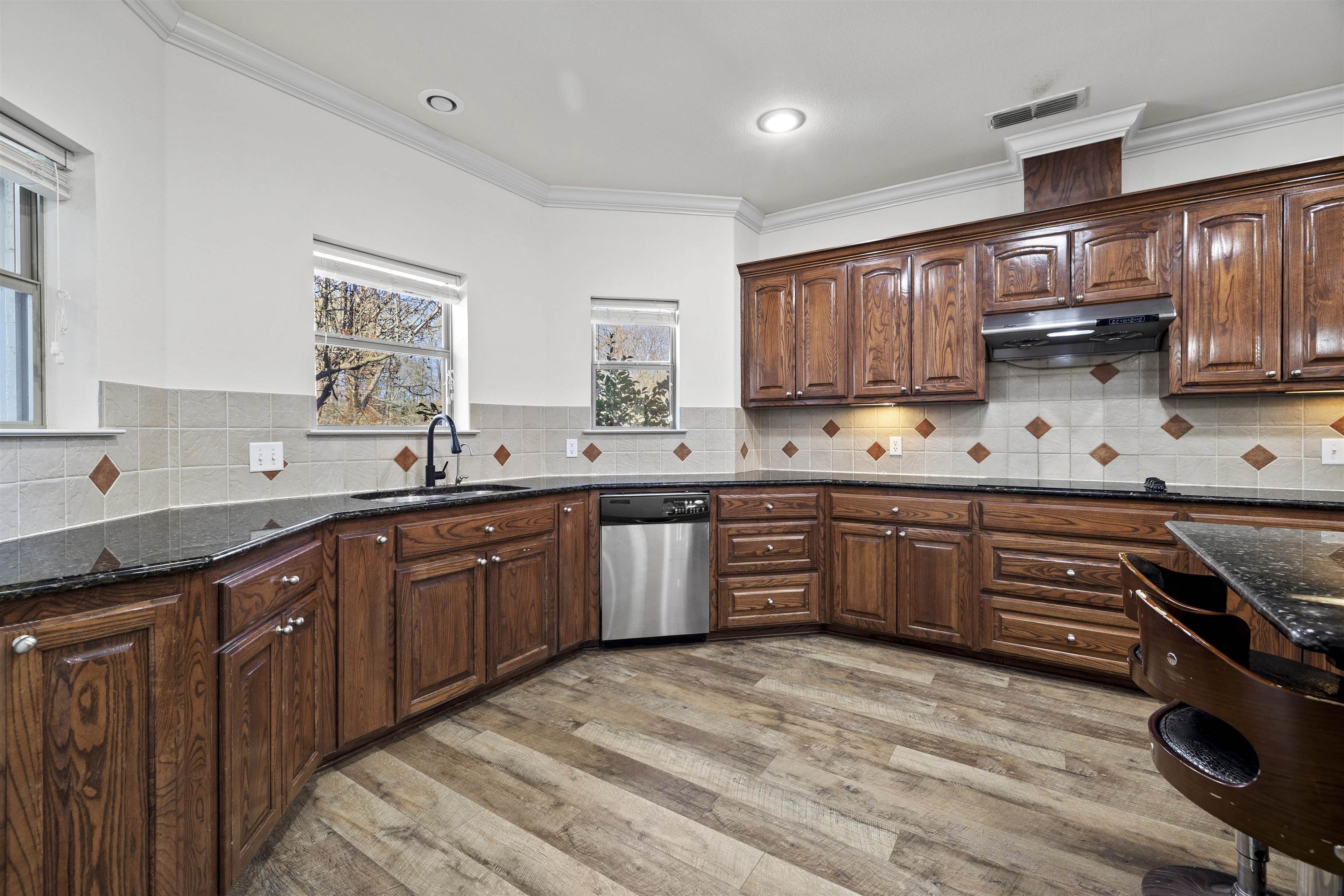 Beautiful home located in sought-after Hallsville ISD offering a versatile split-bedroom layout with 5 bedrooms and 3 bathrooms. The home features a spacious open concept main living area and a well-appointed kitchen with granite countertops, tile backsplash, large island, walk-in pantry, and built-in microwave. Hardwood flooring runs throughout the entire home, including all closets, and is approximately 2 years old. All bathrooms feature waterproof vinyl flooring, providing durability and easy maintenance. The interior was freshly painted in 2026, creating a clean and move-in ready feel. The roof is approximately 2 years old. Natural light fills the home with four skylights located in the kitchen, guest bathroom, and laundry room. The primary suite offers dual sinks, marble countertops, a separate shower, and a spacious walk-in closet. Additional highlights include a 296 square foot sunroom with its own mini-split heating and cooling system, a fully fenced backyard, storage building, and an oversized 2-car garage with extra parking. This property offers a rare combination of quality updates, functional living space, and a highly desirable school district, making it an excellent opportunity in East Texas. |