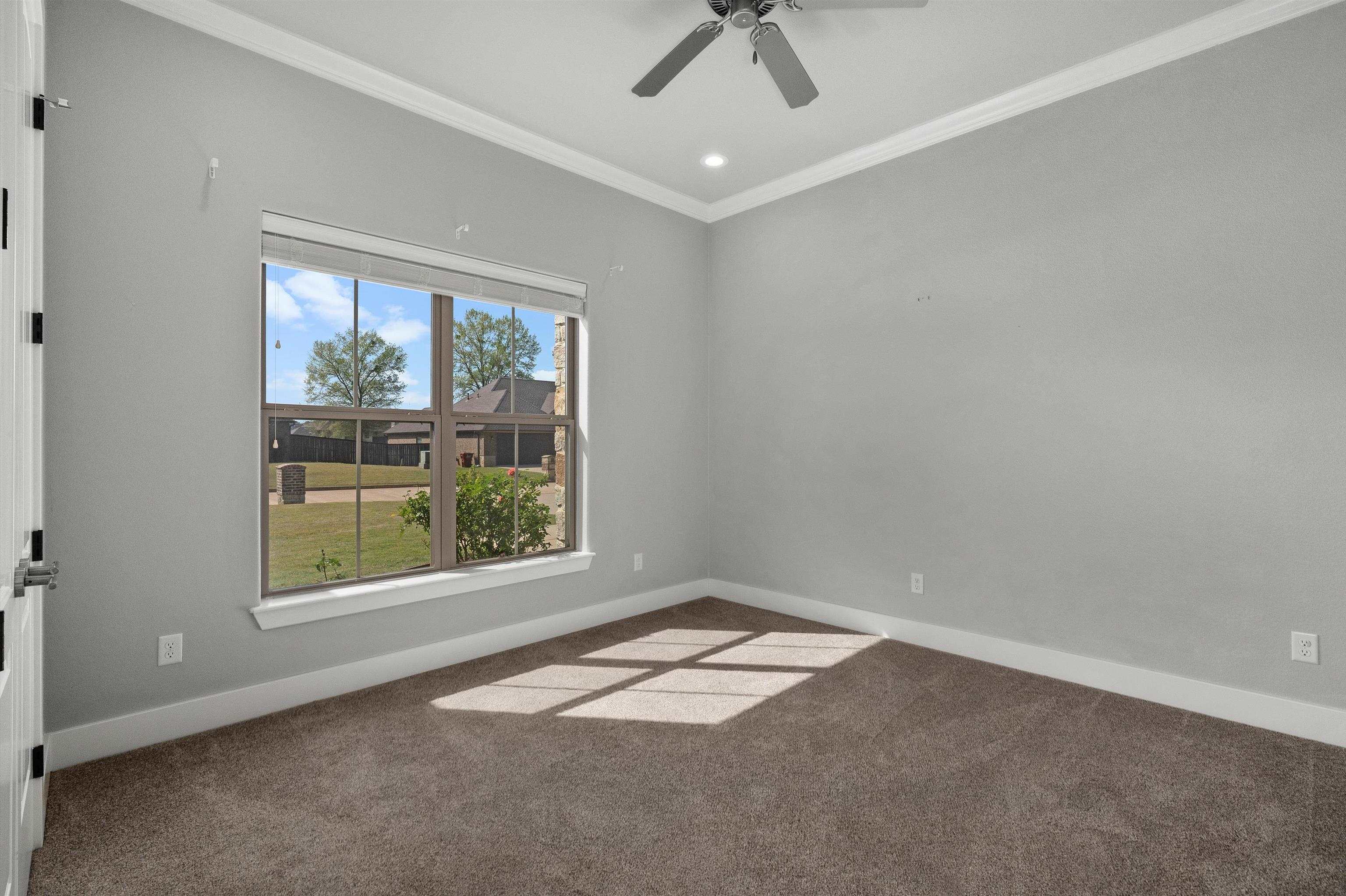 Visually stunning home in the highly sought after Saddle Brook neighborhood of Hallsville, Texas. The wrought iron front door opens into a welcoming foyer and an open living space filled with natural light, large windows, elegant fixtures, and French doors. The living area features coffered ceilings and a brick-and-stone wood burning fireplace framed by lighted custom cabinetry. The French doors lead to the privacy fenced backyard. The island kitchen includes stainless GE appliances, a gas cooktop, floor to ceiling cabinetry, and a striking granite slab countertop. The Primary Suite showcases beautiful fixtures and a wall of windows. The luxurious Primary suite bathroom offers double vanities with impressive lighting, an immaculate walk in shower, and a free standing tub. The large walk in closet connects directly to a fantastic laundry area equipped with open shelving, cabinetry, a long folding counter, a mud bench, and a doggy door leading to the backyard. On the opposite side of the home are three additional bedrooms and a stylish middle bath featuring the same quality fixtures found in the primary suite bath. The garage includes an epoxy coated floor for easy maintenance and a whole home water filtration system—an upgrade that sets this property apart. Outside, a covered patio overlooks the fenced backyard, complete with an island flower bed and a cozy sitting area. The lawn is equipped with an automatic sprinkler system, making for a beautiful and lush yard. Centrally located in Hallsville and just minutes from US Highway 80 and Interstate 20, this remarkable home is the perfect place to call your own. “Please be advised that the amount for yearly property taxes is subject to change depending on the exemptions filed with the appraisal districtâ€. |
